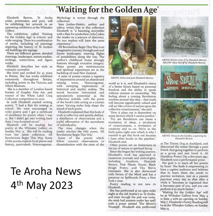 A new art exhibition by Elizabeth Barton is now showing at the Whitaker Gallery in Te Aroha, located at 138 Whitaker Street. The show is a fascinating collection of imaginative and diverse works, many centred on the idea of a coming Golden Age.